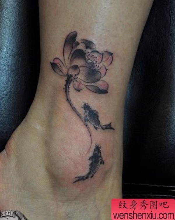女生脚踝水墨画鲤鱼莲花纹身图案