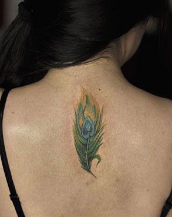 女生喜欢的背部彩色孔雀羽毛纹身图案