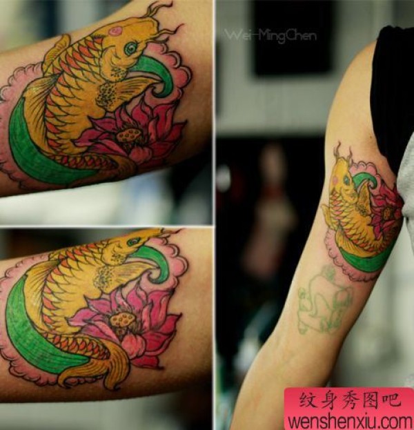 手臂内侧好看的彩色小鲤鱼纹身图案