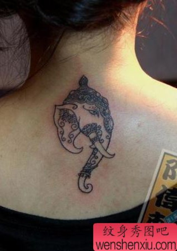 一张女孩子背部象神纹身图案