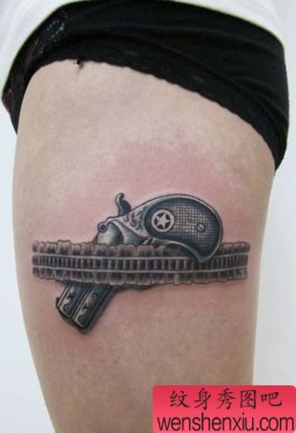 美女大腿经典的蕾丝手枪纹身图案