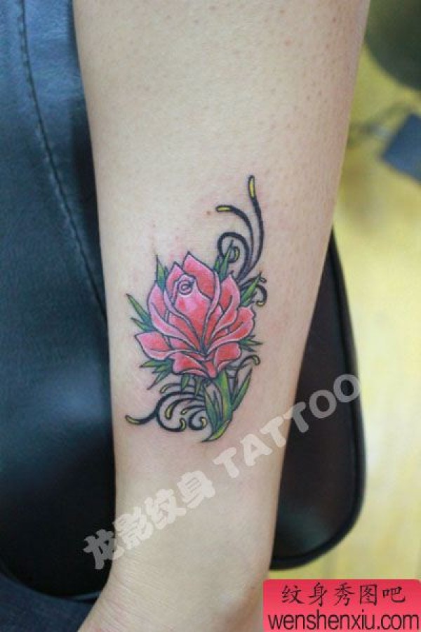 女孩子腿部欧美风格玫瑰花纹身图案