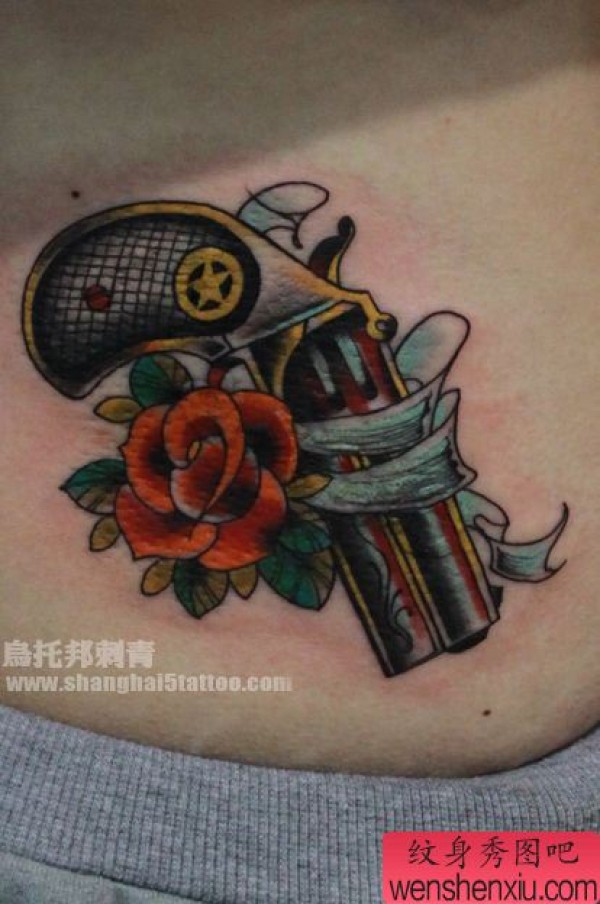 欧美风格小手枪玫瑰花纹身图案