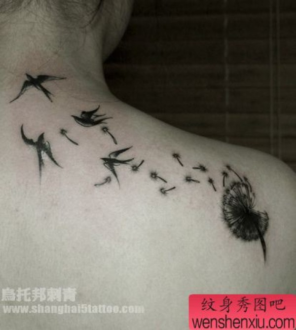 女孩子喜欢的肩部蒲公英燕子纹身图案