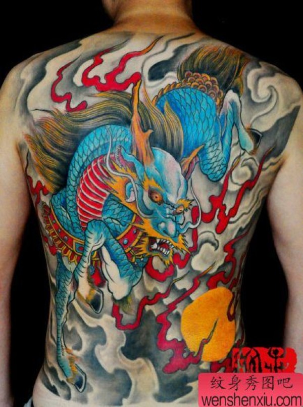 男士喜欢的满背彩色麒麟纹身图案