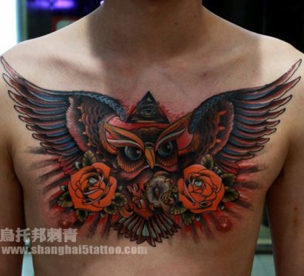 一张胸部猫头鹰玫瑰花纹身图案