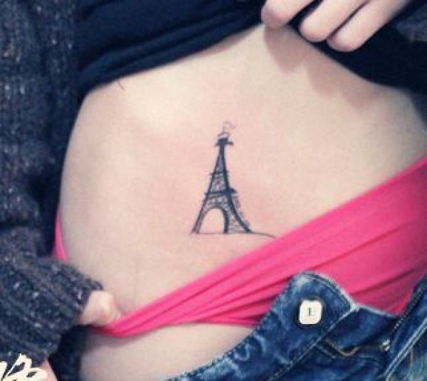 一张女孩子腹部巴黎铁塔纹身图案