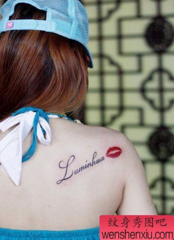 女孩子肩背字母唇印纹身图案