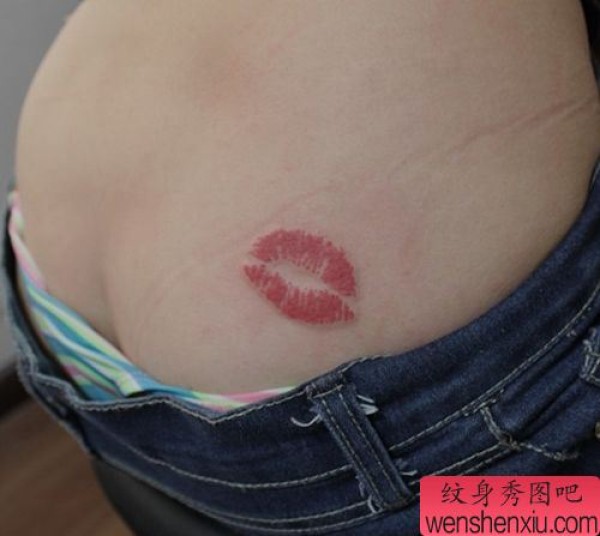 女孩子臀部彩色唇印纹身图案