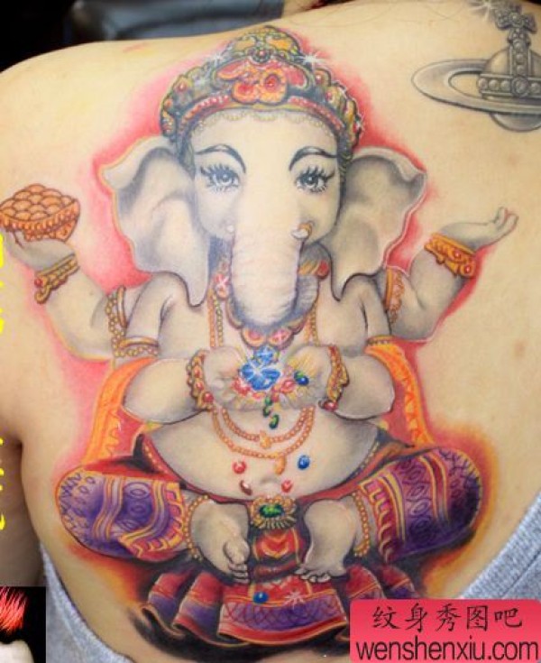 一张女孩子背部象神纹身图案