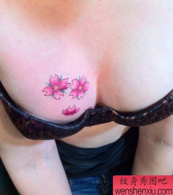 女孩子胸部彩色樱花纹身图案