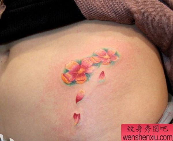 女孩子腹部唯美好看彩色樱花纹身图案