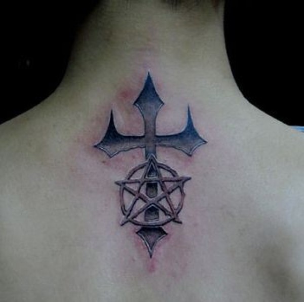 一张背部十字架五芒星纹身图案
