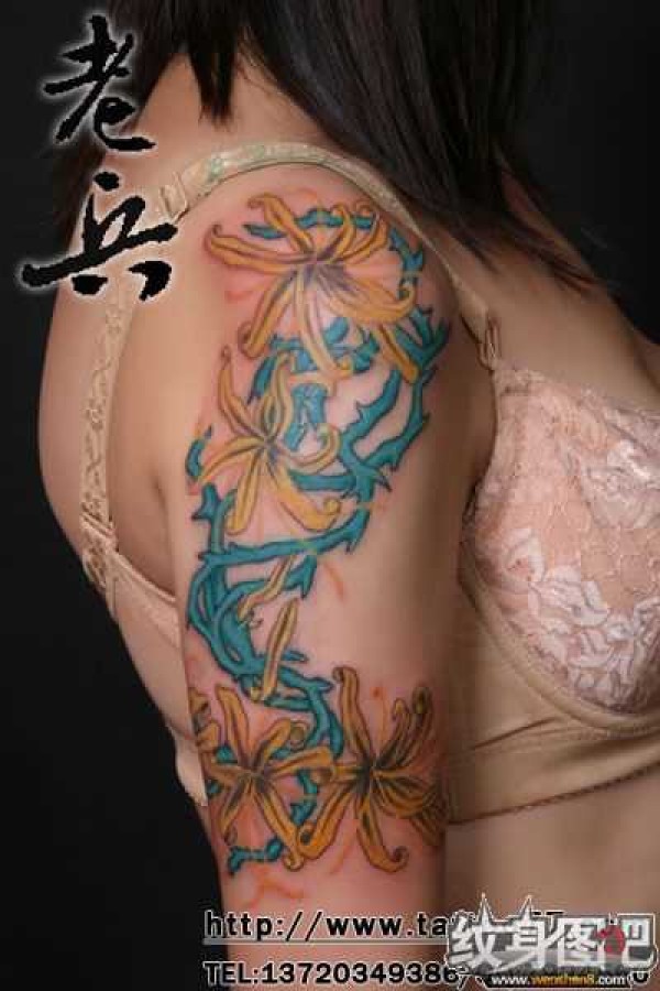 女生肩花纹身_15张女性双肩对称的肩花纹身图案作品图片