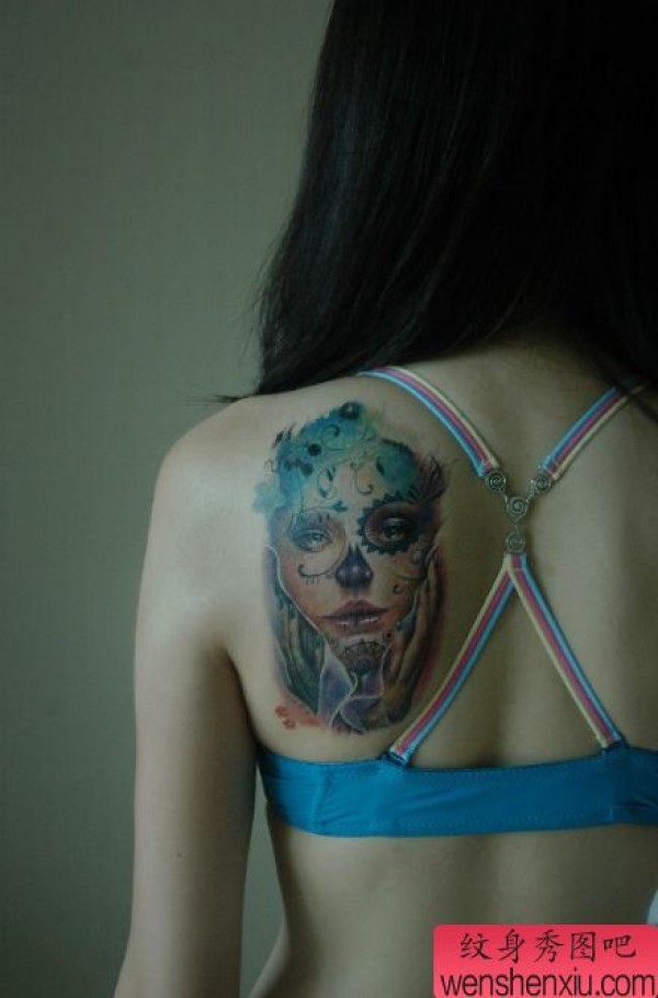 女孩子肩背墨西哥死亡亡灵纹身图案