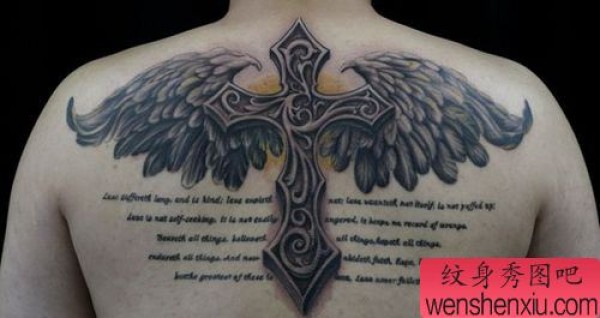 背部超酷的十字架翅膀纹身图案
