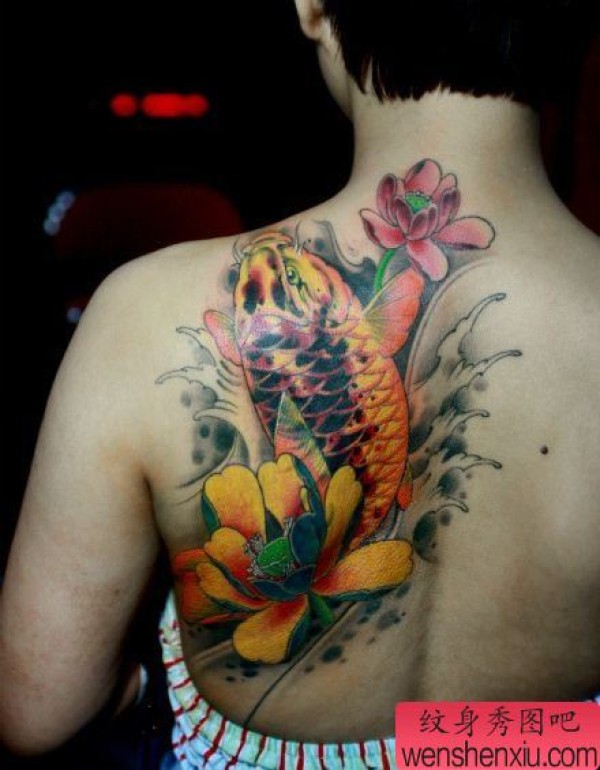 肩背艳丽的一张彩色鲤鱼莲花纹身图案