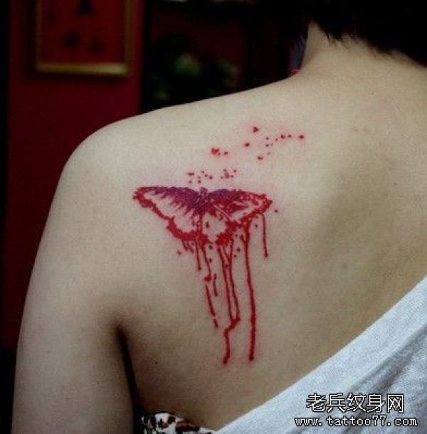 女生肩背精美的彩色图腾蝴蝶纹身图案