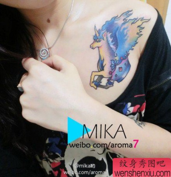 美女胸部精美时尚的一张独角兽纹身图案