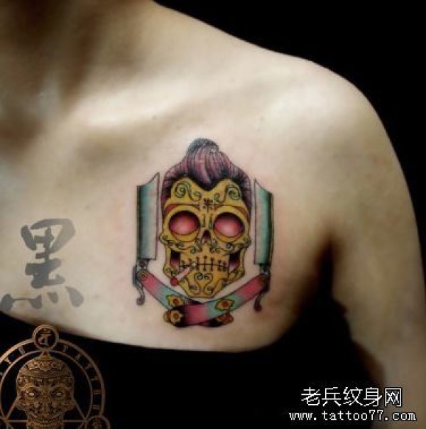 女孩子胸部old school风格骷髅纹身图案