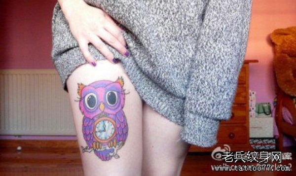 女孩子腿部时尚精美的猫头鹰时钟纹身图案