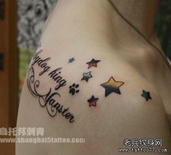 女生肩背五角星猫咪爪印与字母纹身图案
