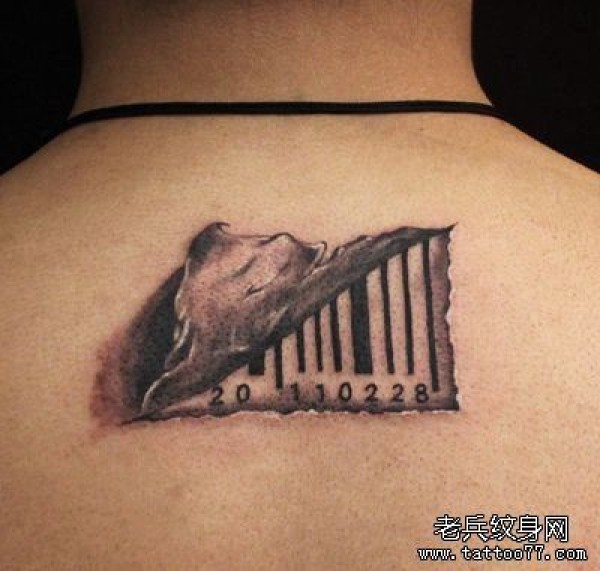 背部一张另类的撕皮条形码纹身图案