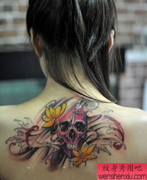 女孩子背部一张彩色骷髅纹身图案