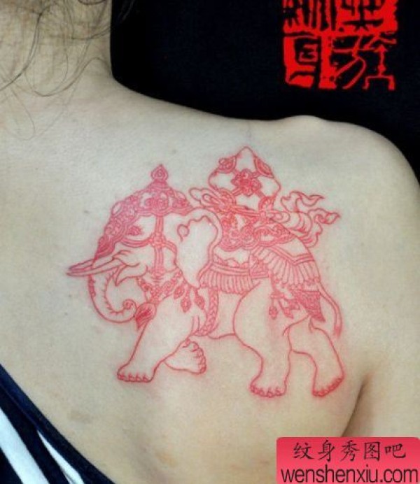 女生肩背一张线条大象纹身图案