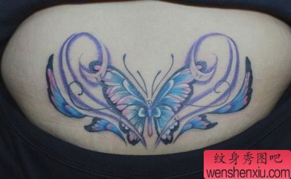 女孩子腰部一张彩色蝴蝶纹身图案