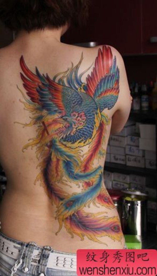 美女背部一张精美的彩色凤凰纹身图案