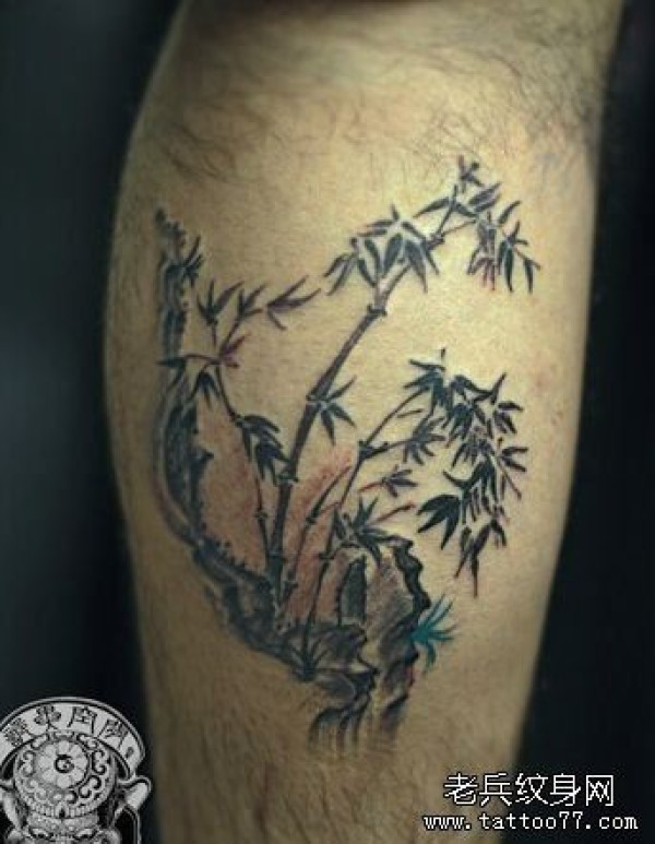 腿部一张黑灰竹子纹身图案