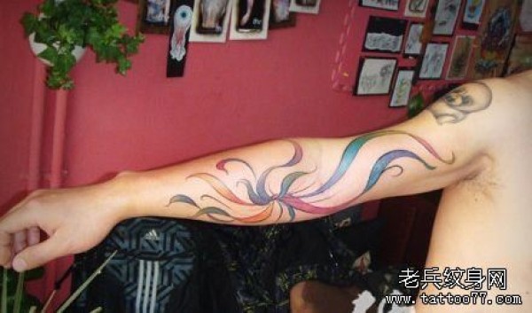 手臂一张精美的图腾彩条纹身图案