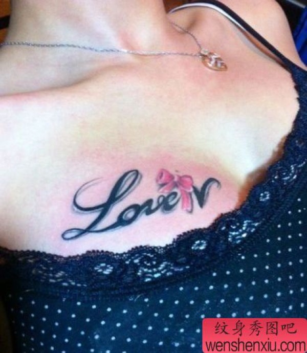 女孩子胸部一张英文字母与蝴蝶结纹身图案