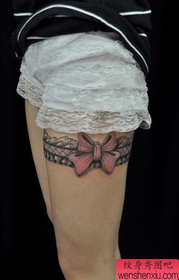女孩子腿部时尚精美的蕾丝与蝴蝶结纹身图案