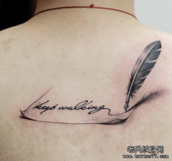 背部时尚的一张写字的羽毛纹身图案