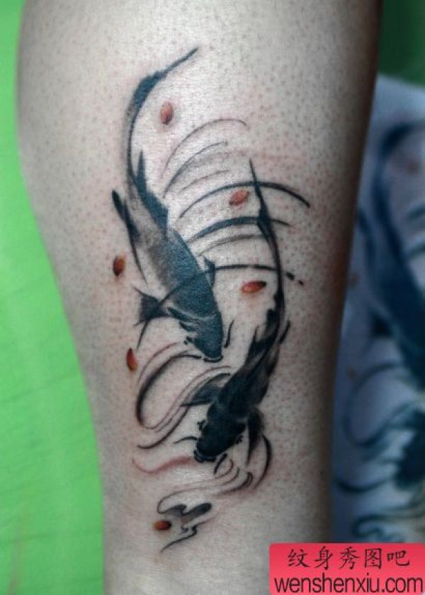腿部一张时尚的水墨画鲤鱼纹身图案