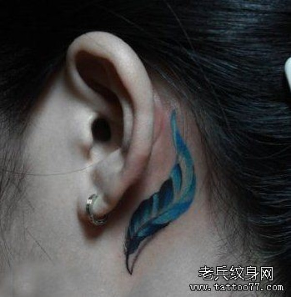 女孩子耳部好看的彩色羽毛纹身图案