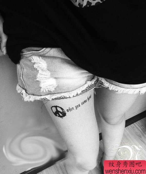 女孩子腿部反战符号与字母纹身图案
