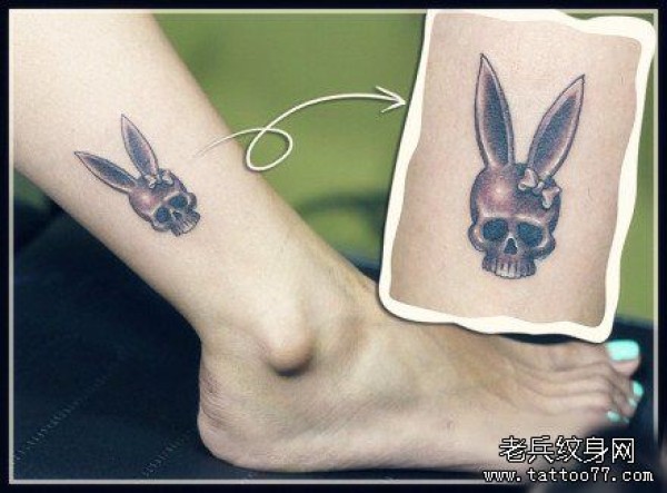 女孩子腿部一张兔耳朵的骷髅纹身图案