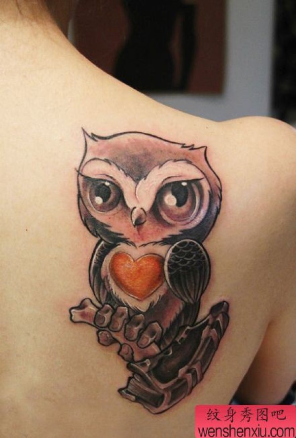 女生肩背一张可爱的卡通猫头鹰纹身图案