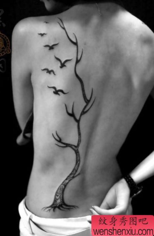 美女背部时尚唯美的图腾树与小鸟纹身图案