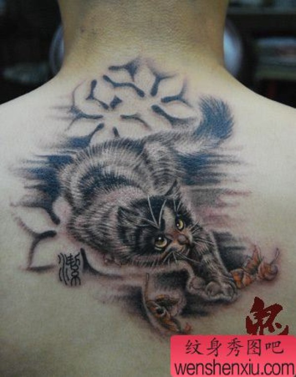 男孩子背部可爱的猫咪纹身图案