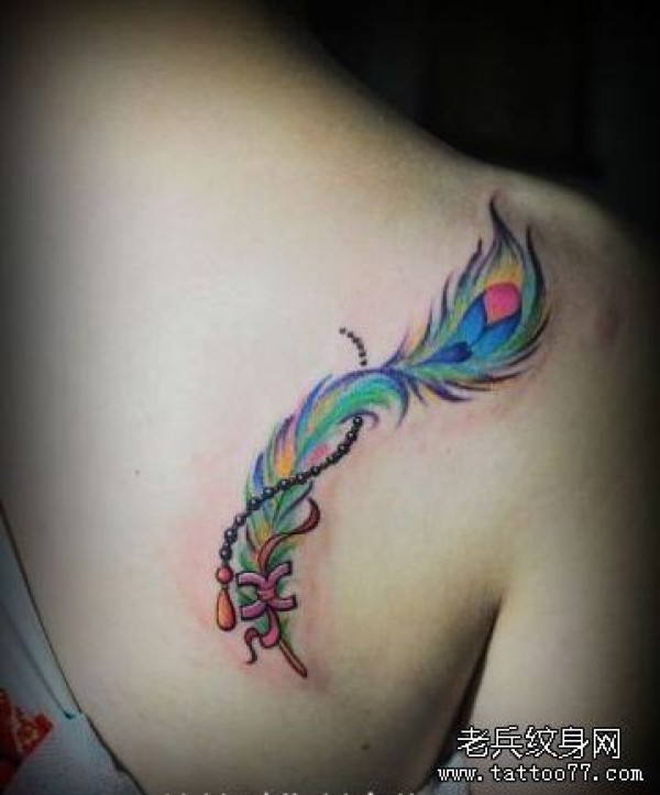 女孩子肩背漂亮的彩色羽毛纹身图案