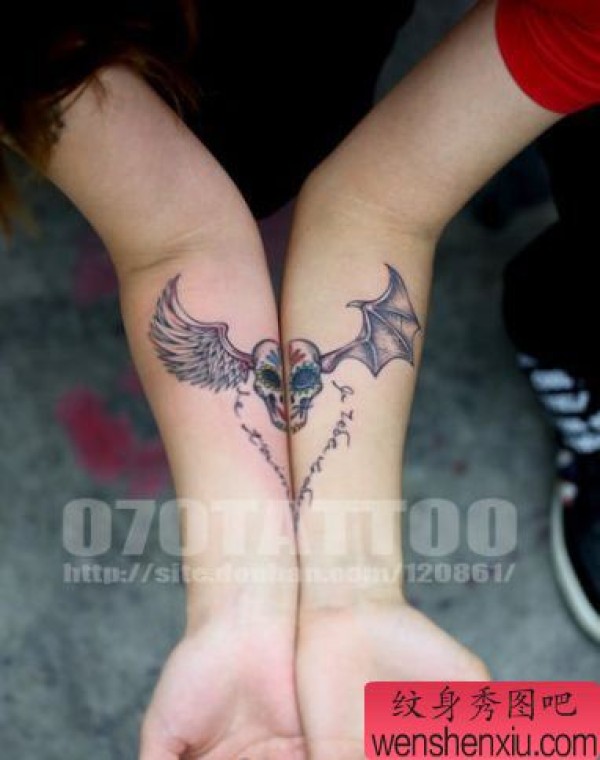 手臂时尚精美的情侣骷髅与翅膀纹身图案