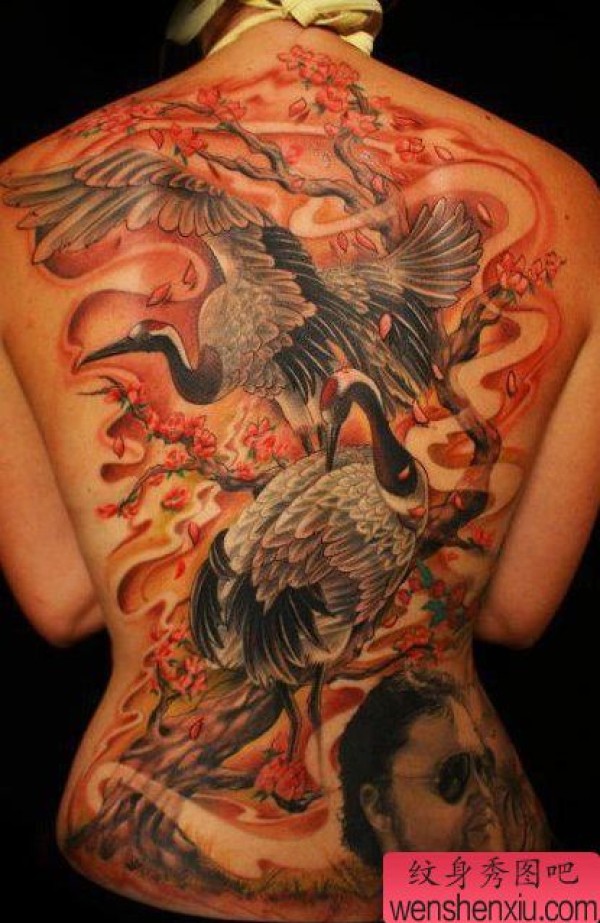 一张美女满背白鹤仙鹤纹身图案