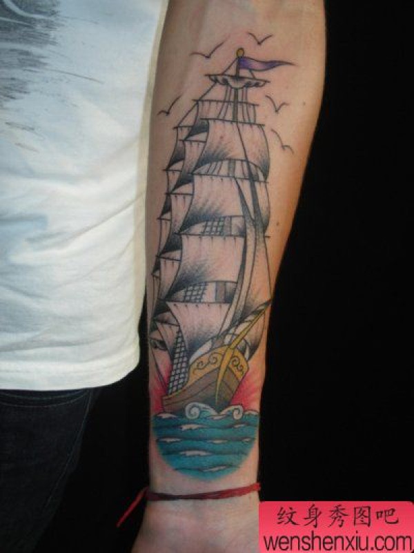 手臂帅气的一张帆船纹身图案