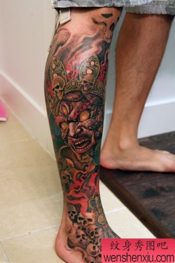 腿部超帅的一张护法神纹身图案