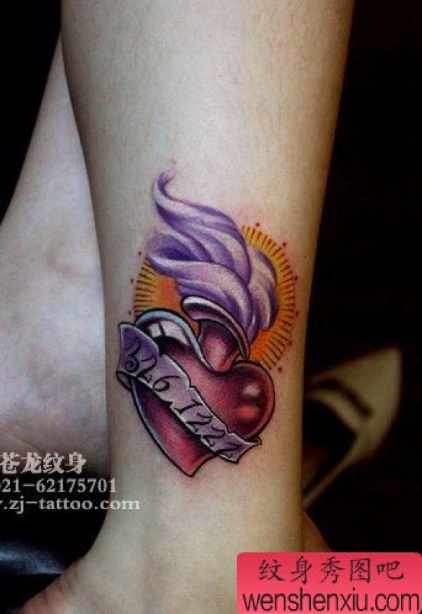 女生腿部漂亮的彩色爱心火焰纹身图案