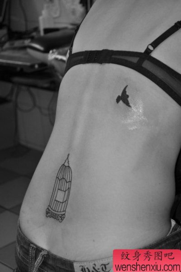 女孩子背部一张时尚的鸟笼与小鸟纹身图案